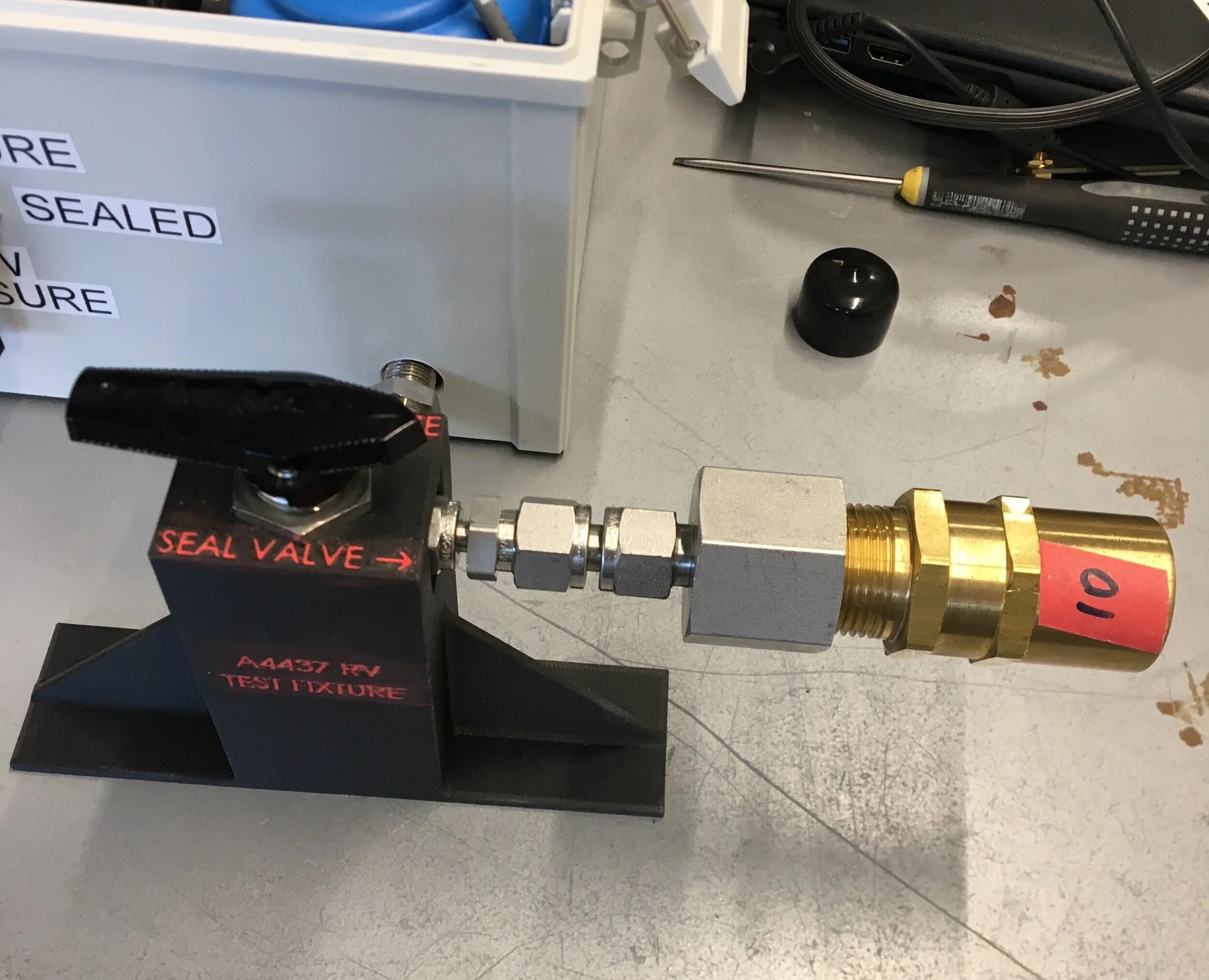 A photo of the Gas Control Panel (GCP) test fixture with the relief valve test fixture attached.
